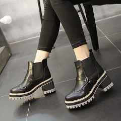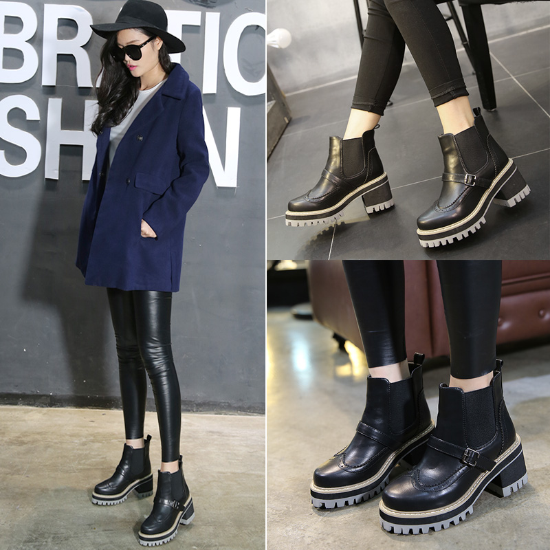 2015秋冬新款潮英伦厚底马丁靴高跟皮带扣棉靴子粗跟短靴女鞋短筒