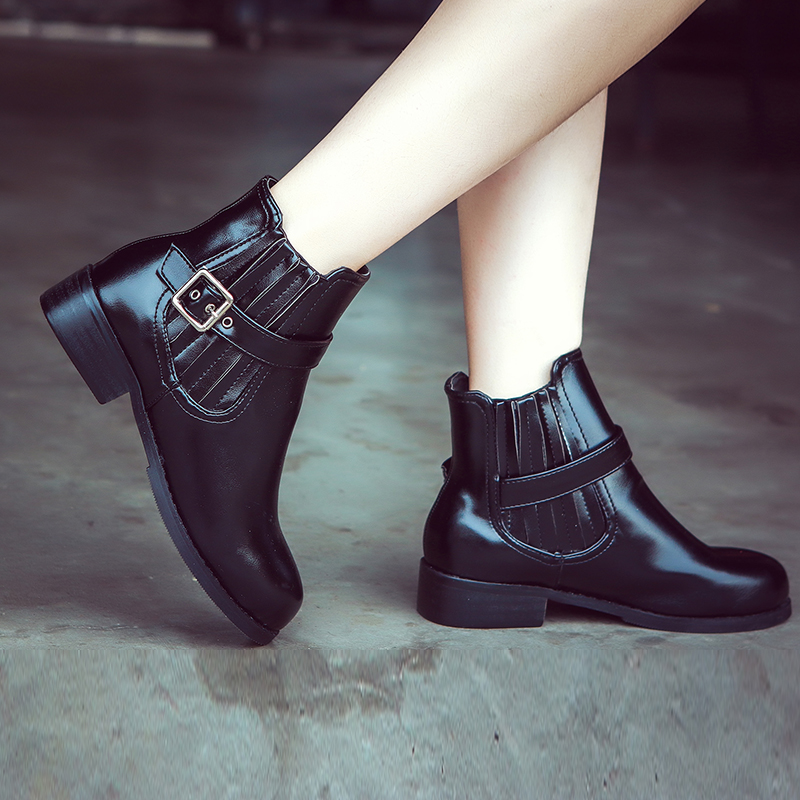 秋冬圆头明星同款皮带扣平底短靴